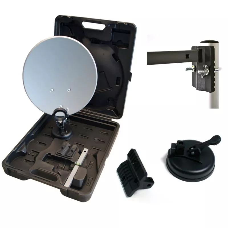 Einfache Handhabung und Montage machen den Aufbau dieser Camping SAT-Anlage vor Ort zum Kinderspiel. Mit dem beiliegendem Saugfuß kann der SAT-Spiegel direkt auf Ihren Wohnwagen, Autodach oder einer Glasscheibe befestigt werden. Alternativ befindet sich auch eine Masthalterung im Koffer mit der Sie den SAT-Spiegel auch an einem Sat-Mast oder Geländer bis 40mm Durchmesser anbringen können. Der Campingkoffer aus Kunststoff ist leicht und stabil zugleich, alles gut geschützt.