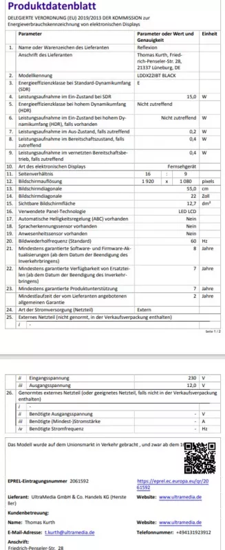 • Stromverbrauch (SDR): ca. 16 kWh/1000 h (manchmal auch 17 kWh/1000 h)