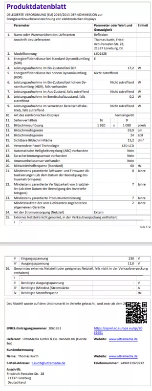 - Betrachtungswinkel 178°/178° (H / V), Videotext 1000 Seiten